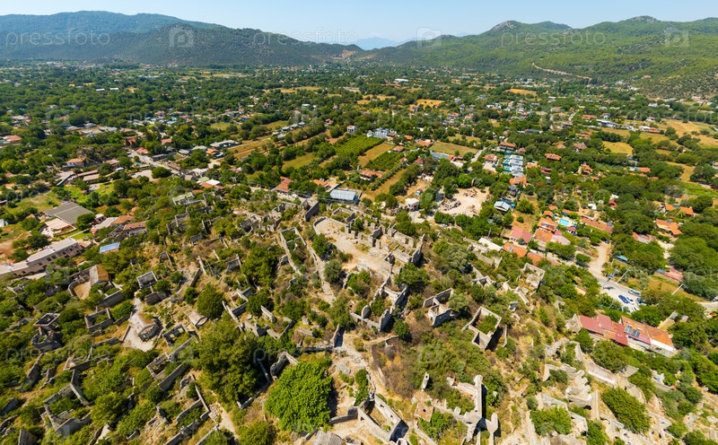 Панорамный вид, показывающий поразительный визуальный контраст между руинами древнего города-призрака Левисси и современным развитием города Фетхие на лесистых горных склонах под чистым небом