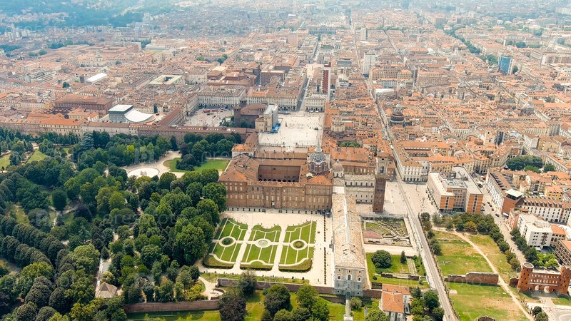Турин, Италия Комплекс зданий Королевского дворца в Торине Панорама исторического центра города Летний день с воздушным видом