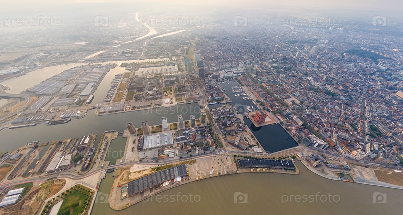 Антверпен, Бельгия. Панорама города. Река Шелда (Эскаут). Летнее утро. Вид с воздуха