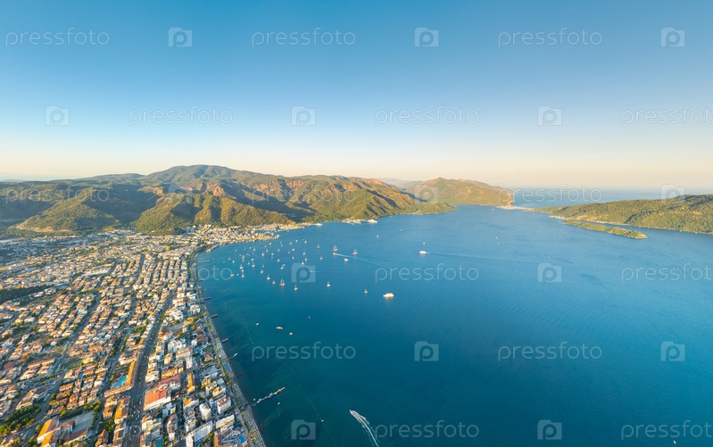 Панорамный вид из воздуха на город, горы, береговую линию с отелями и пляжами, залив с яхтами и островами в солнечных лучах. Полный прибрежный ландшафт под золотистым светом. Вид с воздуха