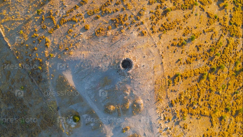 Бодрум, Турция. сверху вниз воздушный вид беспилотника прямо над руинами ветряных мельниц Bodrum показывая круглые каменные фундаменты и планировку.