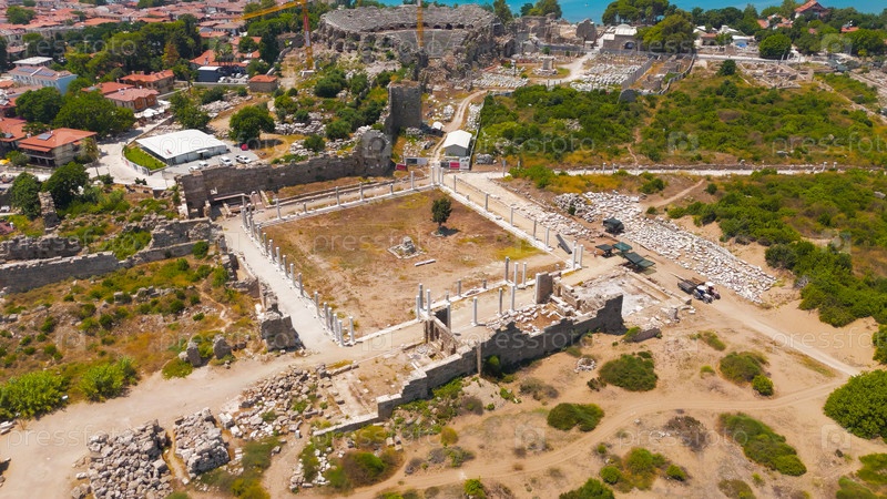 Сид, Манавгат, Турция.Древняя площадь Агоры археологический участок с колоннадами и руинами, средиземноморское прибрежное местоположение вид из воздуха