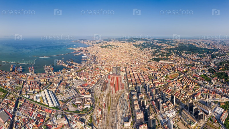 Неаполь, Италия. Железнодорожный вокзал - Napoli Centrale. Панорама города в летний день. Солнечная погода. Вид с воздуха