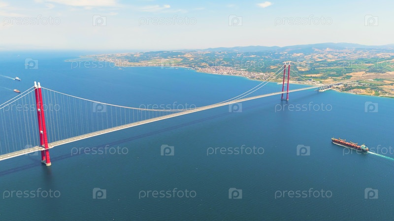 Лапсеки, Турция.Весьма широкий взгляд с воздуха на мост 1915 года в Канаккале с движущимися автомобилями, город Лапсеки и воды Дарданеллов