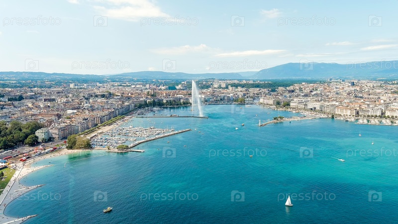 Женева, Швейцария. Фонтан Дже-Дэу. Большой фонтанный реактив до 140 метров. Главная достопримечательность Женевского озера. Летний день, Aerial View