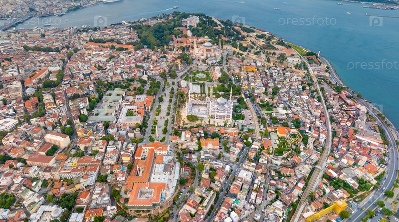Стамбул, Турция Видео с беспилотника показывает площадь Султанахмета Голубая мечеть Святая София на закате облачное небо