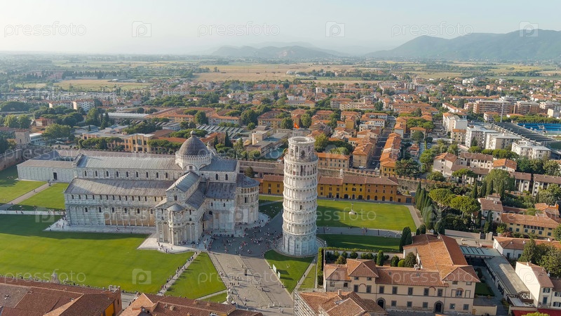 Пиза, Италия. знаменитая наклонная башня и пизанский собор в Пьяцце-дей-Мираколи. лето. вечерние часы, взгляд с воздуха