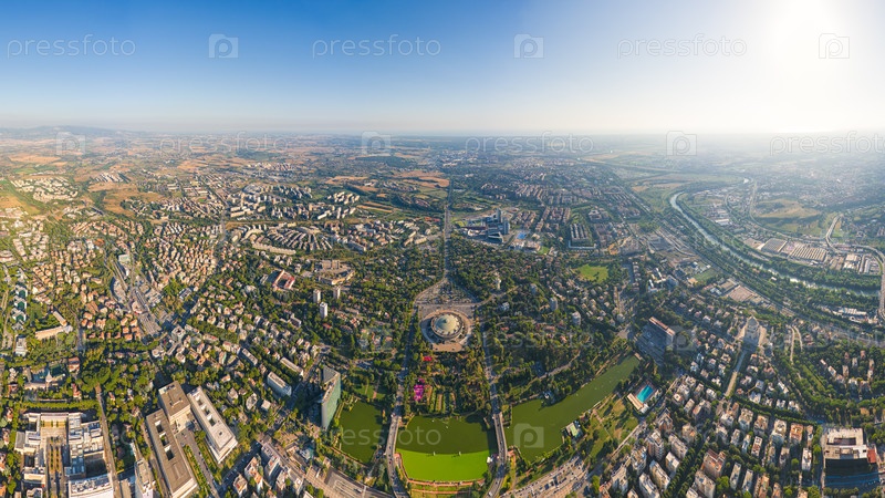 Рим, Италия. Всемирный выставочный квартал - EUR. Панорама города летом утром. Солнечная погода. Вид с воздуха