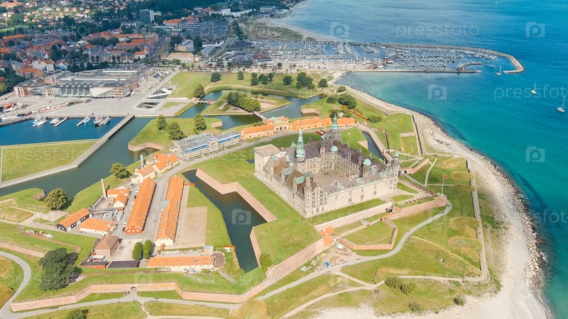 Хельсингор, Дания. Замок 16-го века с банкетным залом и королевскими палатами. Прототип замка Элсинор в пьесе "Гамлет", взгляд из воздуха