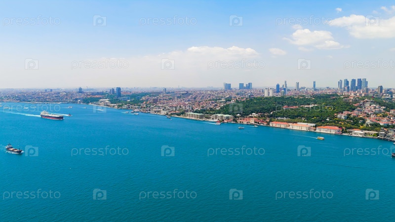 Панорамный вид Босфорского пролива с горизонтом города и достопримечательностями в яркий солнечный летний день