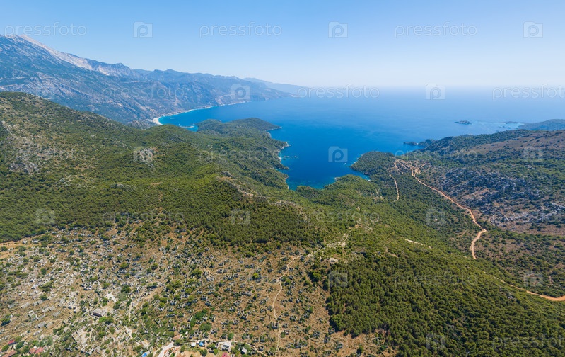 Каякой, Турция.Панорамный вид из воздуха на древние руины города-призрака на лесистых горных склонах с средиземноморским побережьем и морем под ясным летним небом, исторический пейзаж