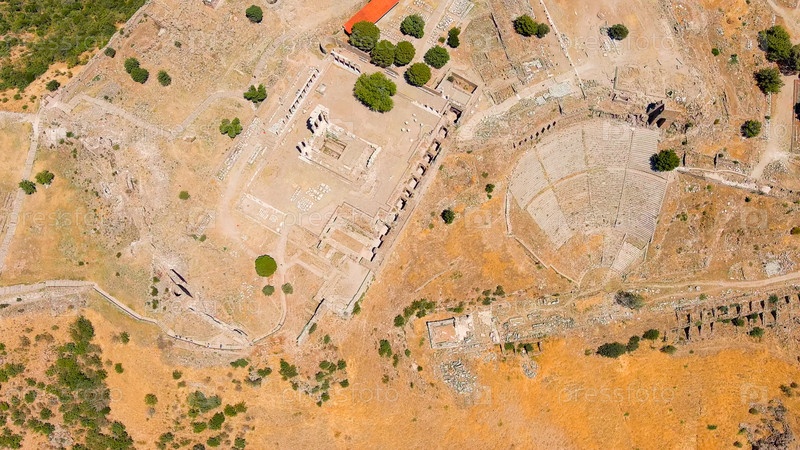 Вершина акрополя с Тражанеем, алтарем Зевса и крутым Пергамским театром со резервуаром Кестельской дамбы на заднем плане в ветреный жаркий полдень