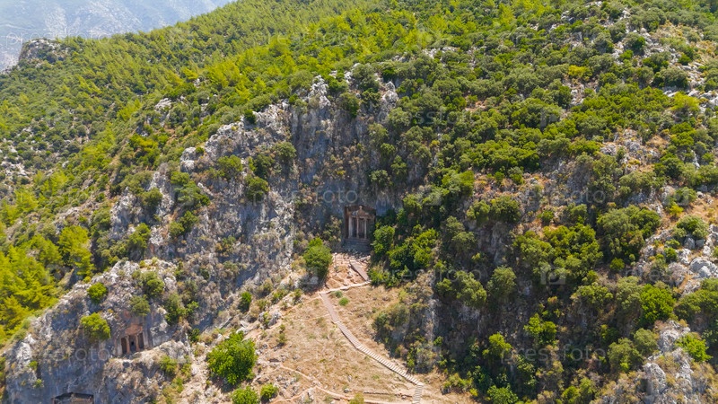 Археологическое исследование ликийских скальных гробниц и знаменитой могилы Аминта из 350 года до н.э. на обрывах, вид с дронов.
