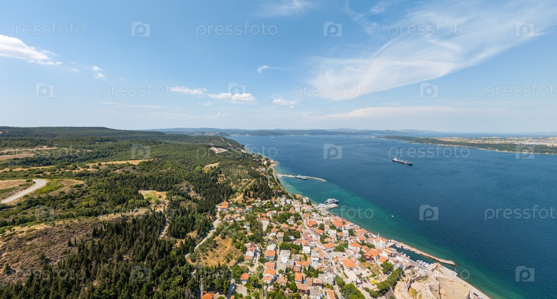 Вид с воздуха солнечного летнего дня на европейском берегу Дарданелльского пролива с зелеными холмами возле Гелиболу