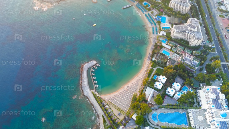 Панорамный взгляд с воздуха на прибрежную туристическую инфраструктуру с отелями, бассейнами, пляжами и дорогой, заканчивающийся золотым закатом над средиземноморским побережьем.