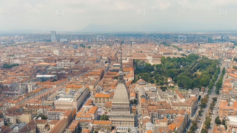 Турин, Италия. Mole Antonelliana - величественное здание 19-го века. Панорама города. Летний день, Aerial View
