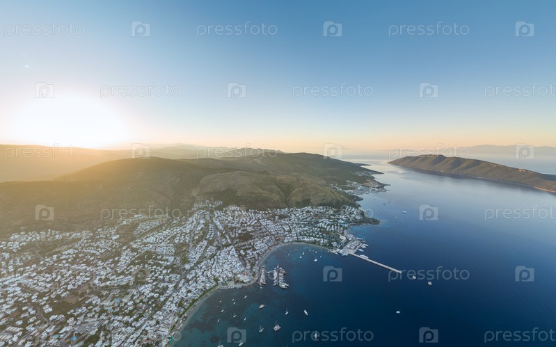 Медитативная утренняя панорама гармоничной белой архитектуры, спокойной бухты с нежными яхтами и духовных островов в тихой Эгейской атмосфере