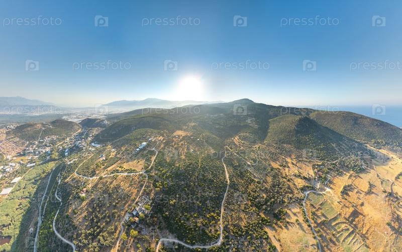 Гелемис, Турция. панорама воздушного пейзажа Патары, зеленые холмы на фоне древних руин и отдаленное побережье, ясное летнее небо. вид с воздуха