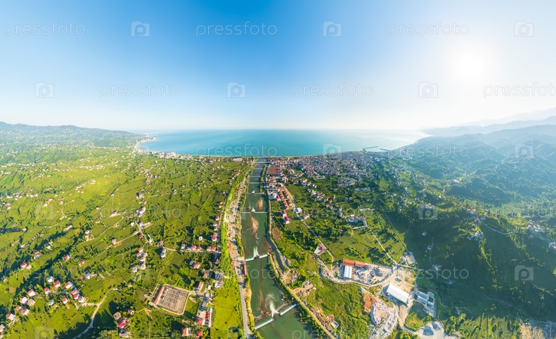 Ардешен, Турция. Город на побережье Черного моря в Турции. Долина реки Фиртина. Устье реки. Летнее солнечное утро. Панорама. Вид с воздуха