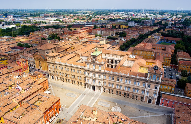 Модена, Италия. Дворец - Palazzo Ducale di Modena. Пьяцца-Рома - Городская площадь. Панорама на город в летний день. Солнечная погода с облаками. Вид из воздуха