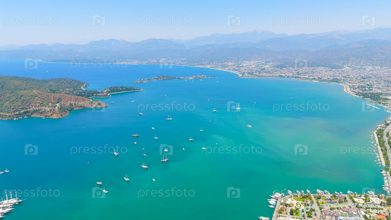 Панорамный снимок воздушным дроном современного города Фетхие с горами, береговой линией, яхтами в марине и красивой бухтой в солнечный летний день.