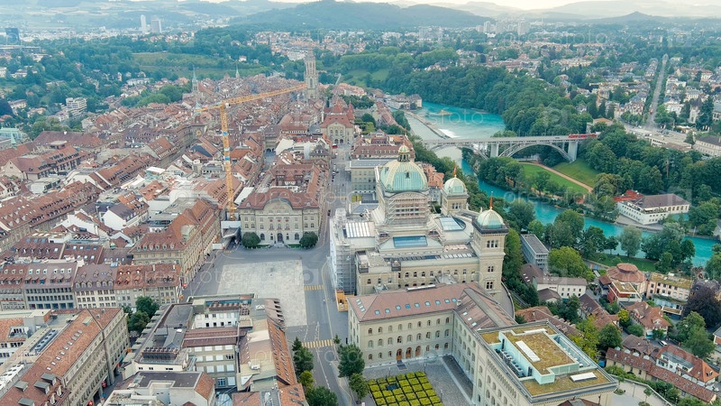 Берн, Швейцария. Федеральный дворец. Панорама города с видом на исторический центр. Летнее утро, Aerial View