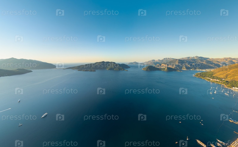 Панорамный взгляд с воздуха на залив с островами, яхтами и горами утром Прибрежный ландшафт с архипелагом
