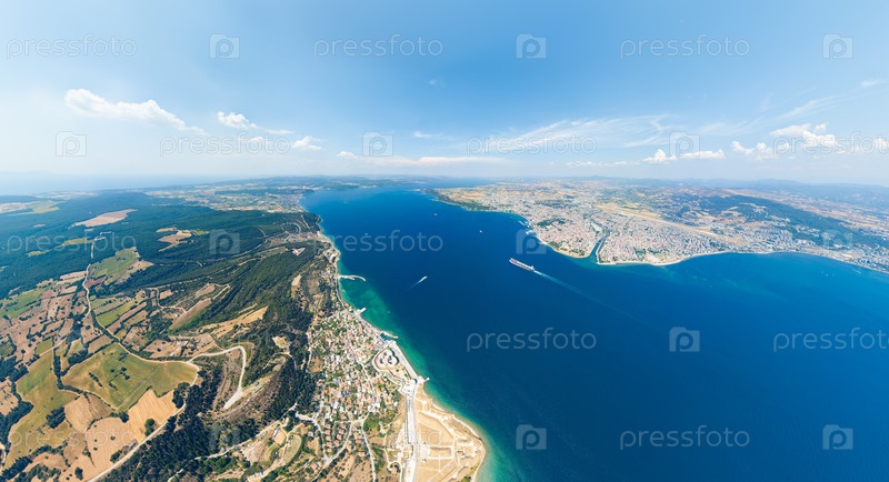 Панорамный пейзаж Дарданелльского пролива с грузовым судном и паромами, исторический замок Килитбахир, бастионы Мечидия и Намазгаха, города Килитбахер и Чанаккале