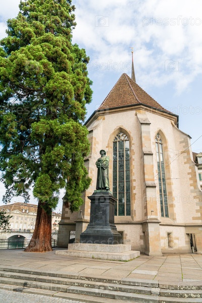Цюрих, Швейцария. Памятник Ульриху Цвингли. Монумент был установлен в 1885 году. Текст на пьедестале гласит: ULRICH ZWINGLI 1 января 1484 - 11 октября 1531