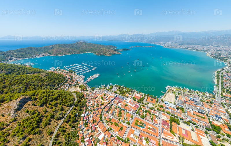 Панорамный вид Средиземноморской бухты с яхтами, горами, набережной и панорамой города