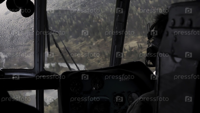Пилот летает в вертолете.Клип: Человек управляет вертолетом на фоне леса