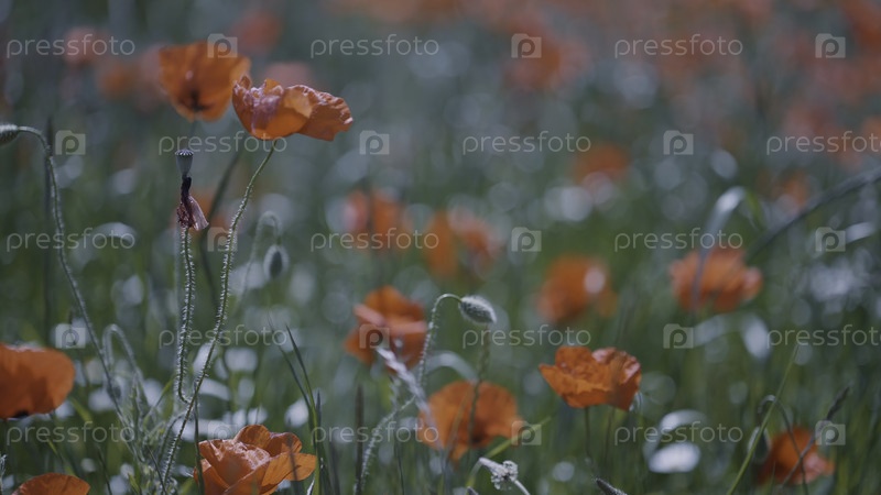 Большое поле с красными маками и зеленой травой на закате солнца в летний солнечный день. Действие. Прекрасное поле со цветами оранжевых маков