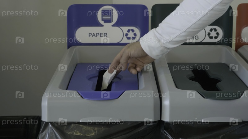 Выбросить лист бумаги в специальную корзину для переработки отходов, концепция экологии. HDR. Близкий снимок мужской руки, помещающей небольшой листок бумаги в корзинку