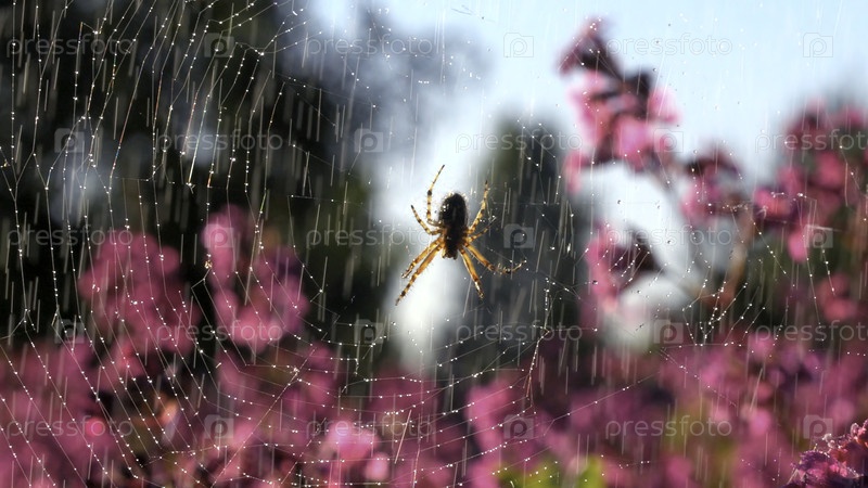 Летний теплый дождь, падающий на цветущие цветки и насекомых