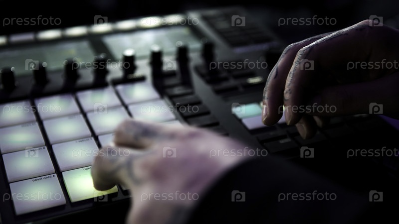 Ближайшее изображение диджея, работающего с профессиональной барабанной машиной в ночном клубе