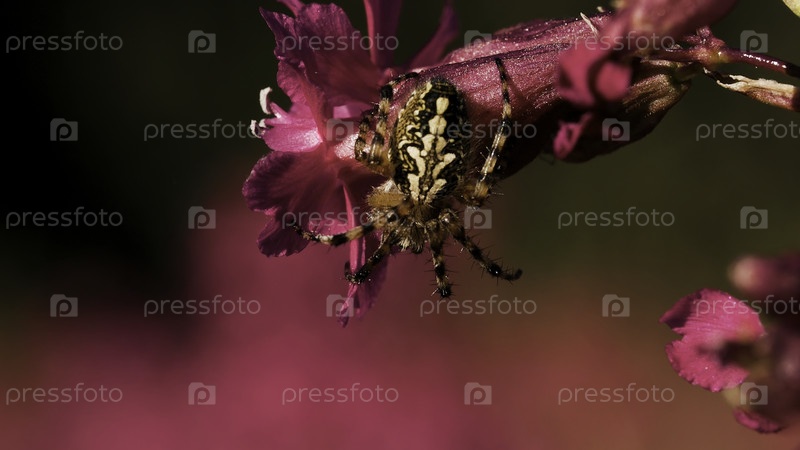 Большой оранжевый паук .Креативный.Прекрасная яркая орхидея, на которой паук сидит спиной