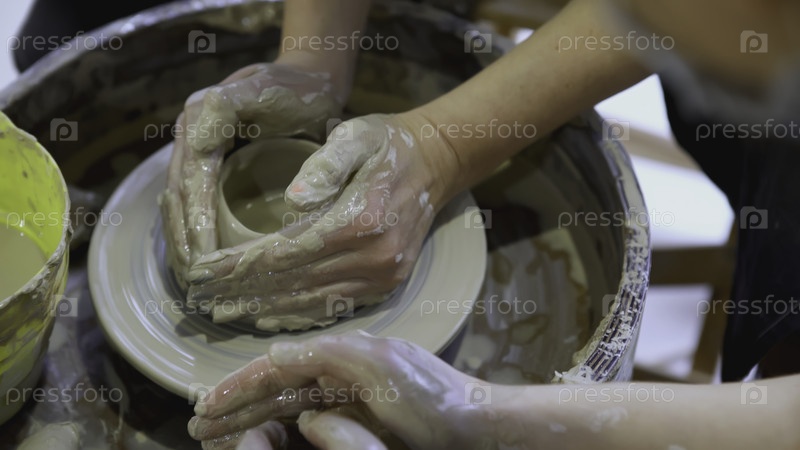 Руки ребенка на гончарном колесе скульптурируют горшок. ИСТРЕНИЕ. Руки взрослого и ребёнка в ближайшем плане занимаются керамикой на фестивале