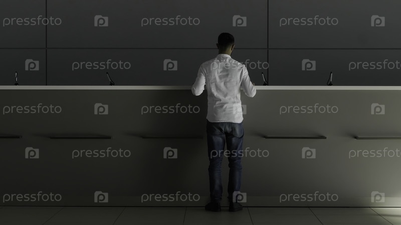 Минималистский интерьер гостиничного лобби с приемной. HDR. Задний вид бизнесмена в белой рубашке, идущего к секретарше и спрашивающего что-то