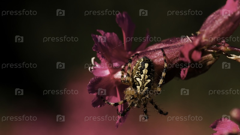 Большой сидящий паук сидит спиной с красивым узором.Креативный.Большой прекрасный паук на маленьком розовом цветочном бутоне