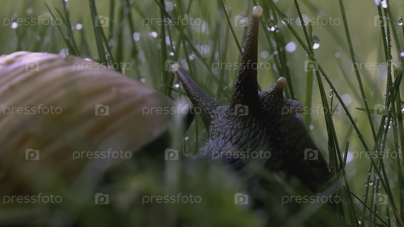 улитка в траве. творческий. антенны улитки в зеленой траве и росе. макромир зелёного луга