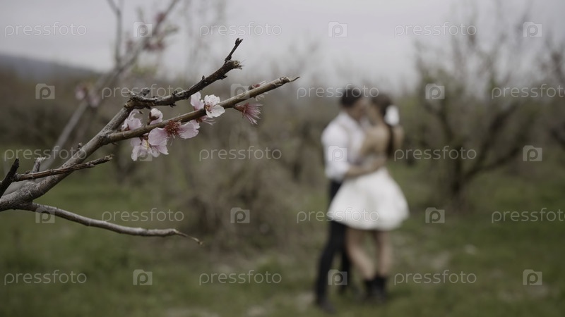 Фотосессия на фоне орхидеи.Акция.Невеста и жених в коротком белом платье и завесе, которые целуются и гладят друг друга рядом с деревом с розовыми цветами archidea