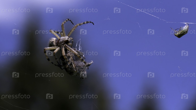 Большое насекомое.Креативно.Паук пытается переместить большой сухой объект по своей паутине на фоне голубого дневного неба