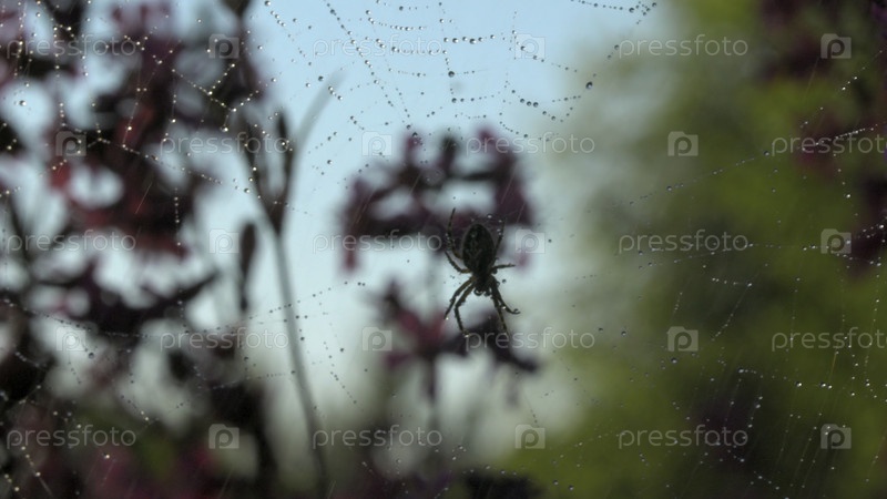 Большой паук, висящий на паутине на размытом зеленом и розовом фоне.Креативное фото.Ближайшее изображение насекомого на летнем поле под падающим дождем