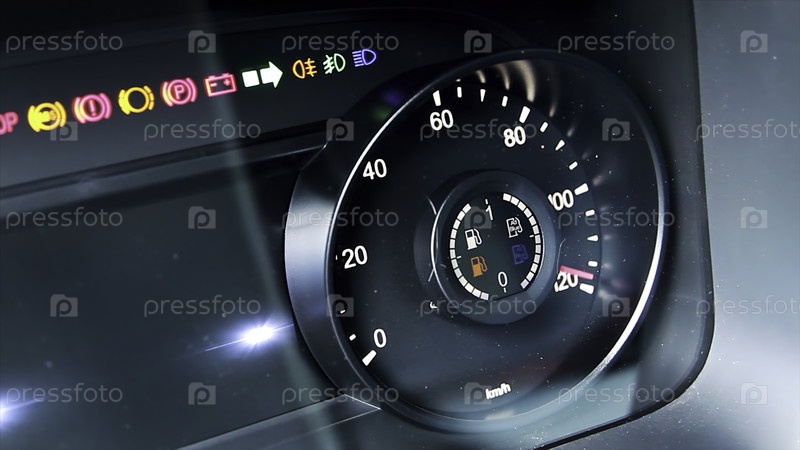 Детали тахометра автомобиля с увеличением значения оборотов в минуту Сцена Близкий снимок современной панельной доски с горящими индикаторами