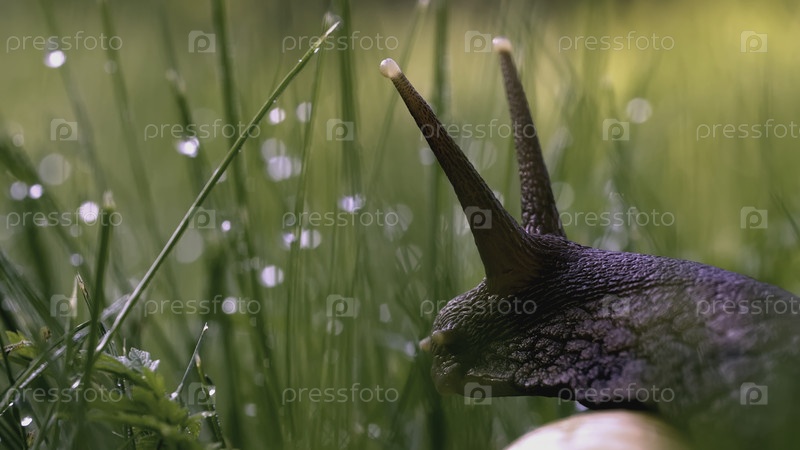 улитка в траве. творческий. антенны улитки в зеленой траве и росе. макромир зелёного луга