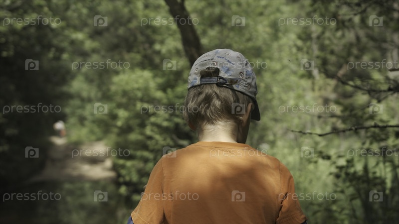 Мальчик гуляет по лесу. творческий. мальчик ходит один по лесной тропе в солнечный день. прогулка по лесу