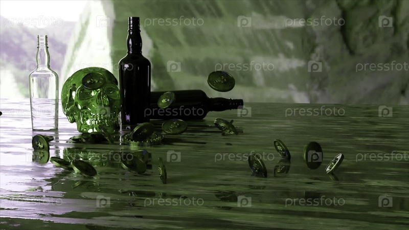 Абстрактный деревянный стол с пустыми бутылками рома, человеческим черепом и падающей горсткой монет. Дизайн. Пиратская тема, интерьер бара или паба