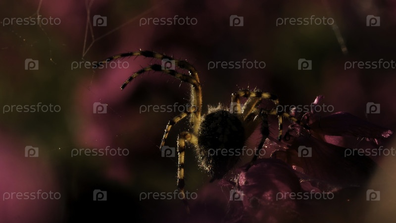 Большой тарантул в макрофотографии.Креативный.Большой пушистый паук на паутине рядом с фиолетовой орхидеей