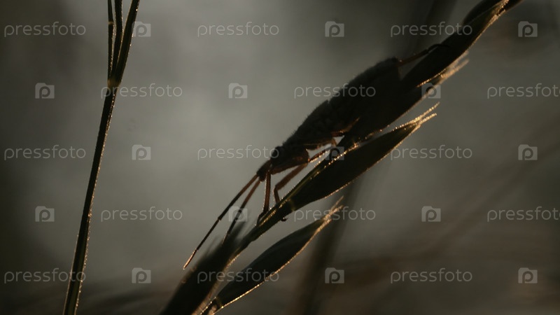 Ландшафт с большими насекомыми с длинными усами. креативность. макрофотография цветов, на которых насекомые ползут по траве