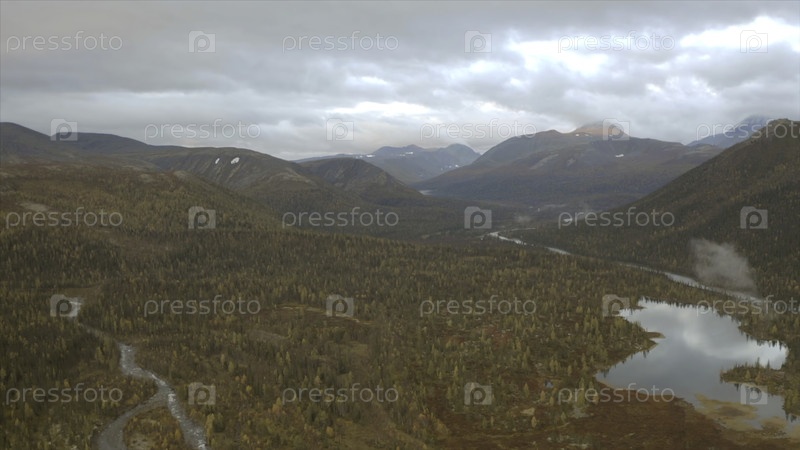Вид с воздуха на осенний красочный лес, озера и болота под облачным небом. Клип. Холмистая местность, дикий природный пейзаж, Тайга, Россия
